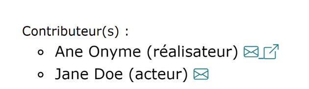 Nom/prénom: obligatoire.Courriel: adresse email pour contacter le contributeur directement depuis Pod.Rôle: obligatoire, à choisir parmi une liste prédéfinie (intervenant, auteur...).Lien web: adresse d'un portfolio, réseau social, etc.